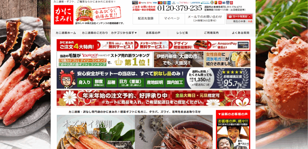 信頼性、ボリューム、価格、品質のすべてを兼ね備えた「かに本舗」は「美味しいカニをコスパよく」「特別な日に贅沢を」というニーズに応えてくれる通販サイトです。