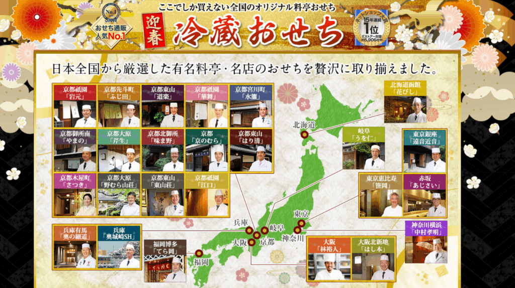 全国の有名料亭や名店とコラボした本格的なおせちを数多く取り揃えており、毎年多くの方に選ばれています。