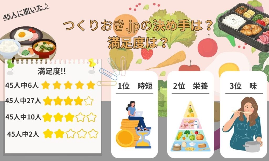 今回は、つくりおき.jpを利用している45人に聞いたアンケート結果やつくりおき.jpのデメリットやメリットを紹介します。